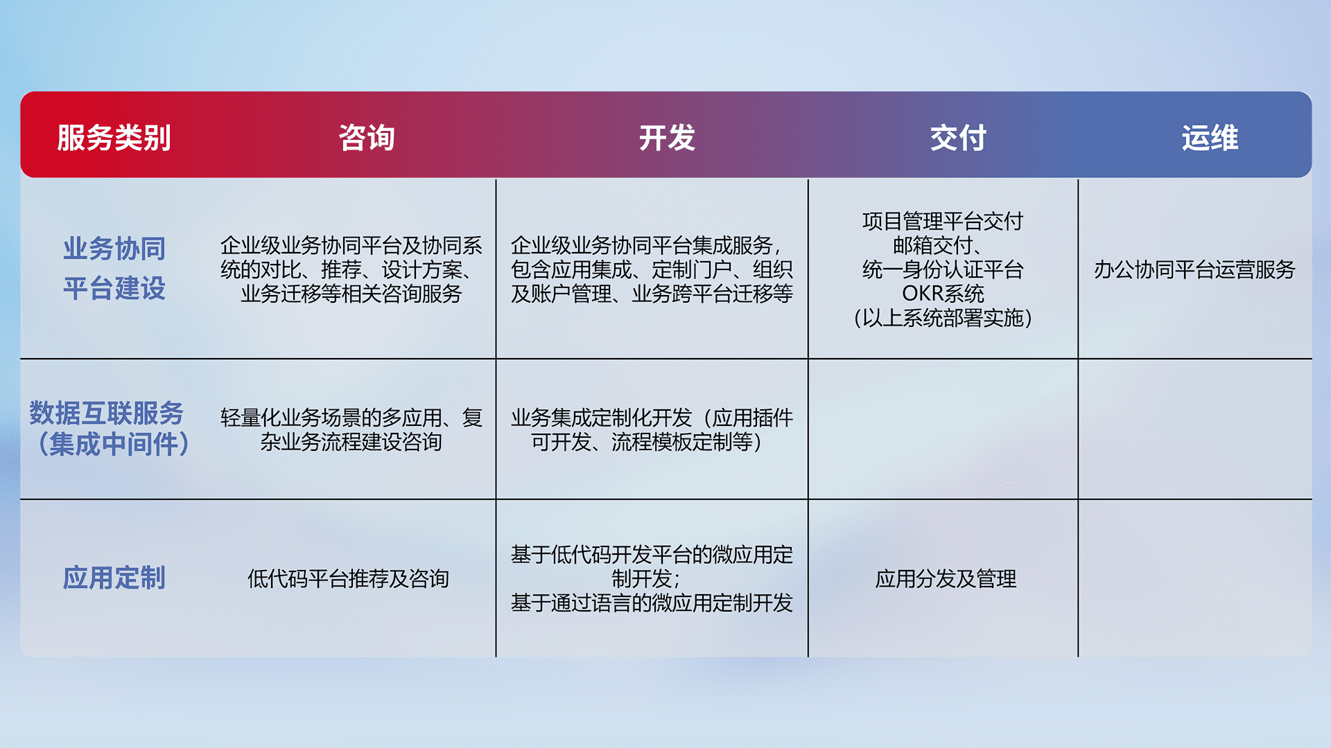 针对钉钉、、、企微、、、、IDaas等平台级产品提供产品的规划、、、方案、、、交付、、、定制化开发等服务,,,实现如统一协同办公、、、、智能客户服务、、、混合会议管理、、智能数据查询、、等业务场景,,实现数字化转型。。。