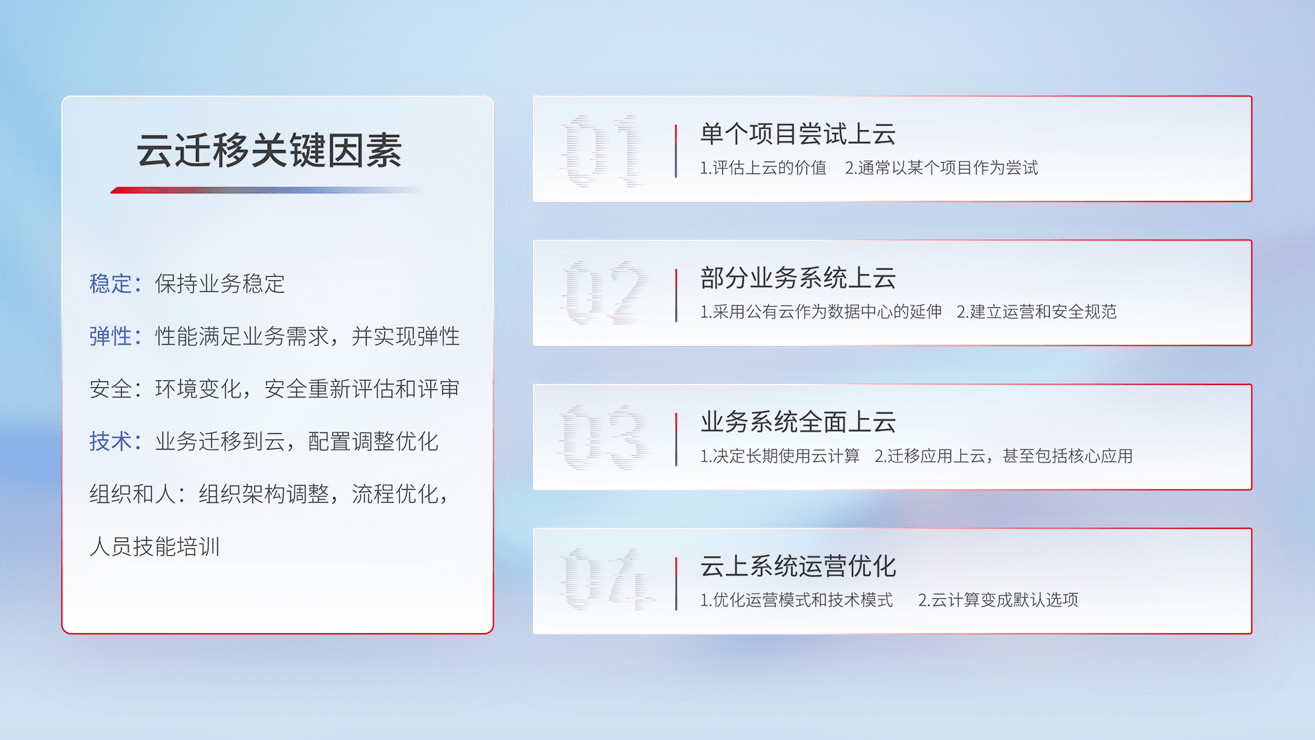 结合实际业务,,从规划设计、、、云平台选型、、、云原生改造、、数据迁移、、、、集成交付,,,,迁移全过程为客户识别最佳上云路径,,做好风险识别管理,,,,设计网络架构、、、、身份权限、、安全审计合规、、、操作审计、、日志审计、、、监控告警策略、、、、多站点容灾设计等,,对云上基础设施进行整体规划,,,,提升IT治理水平,,,以满足弹性、、、高可用、、高性能的需求。。